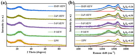 As shown in Figure 8, further XRD and Raman spectroscopic analyses of the char residue formed after the cone calorimeter test of the EP composite material were conducted to obtain detailed structural information. Figure 8a shows the presence of a broad diffraction peak in the range of 20–35° for the post-combustion materials, indicating that the composite materials possessed typical amorphous characteristics; that is, the synthesized materials were amorphous.
