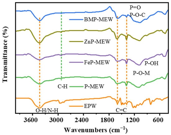 The process for preparing the flame retardant is shown in Figure 1. Firstly, 6 mmol of PA was dispersed in 60 mL of DI, to which 4.5 mmol of ferrous acetate and 4.5 mmol of zinc hydroxide were added to obtain the Zn-Fe bimetallic phytate solution (BP). 24 mmol of MEL was then dissolved completely in ultrapure water at 90 °C and the BP solution was slowly added dropwise to that of MEL. The mixture was then stirred continuously at 90 °C for 4 h so that MEL and BP fully reacted. After the reaction was complete, the product was washed to adjust the pH between 6.0 and 7.0, and the product was vacuum filtered, dried, and ground to obtain BPM as the final product. PM, FePM, and ZnPM were synthesized using the same methodology; however, in the absence of any metal precursor for PM, with ferrous acetate for FePM, and with zinc hydroxide for ZnPM.
