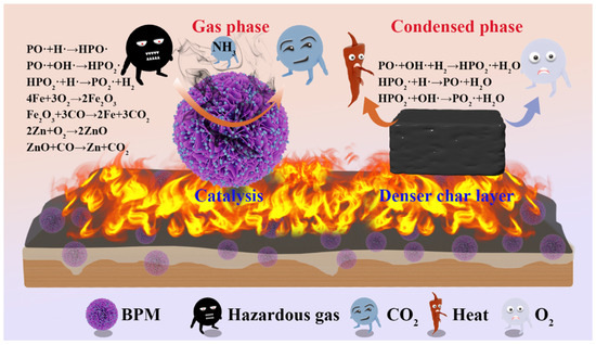 Considering the evolution of the successive roles of BPM in suppressing EP fire hazards, the mode and mechanism of fire protection in the gas and condensed phases were investigated separately (Figure 10). PA, MEL, and metal ions contribute together to the formation of a stable cross-linked network that promotes the development of an expanded coke layer on the surface of EP materials.