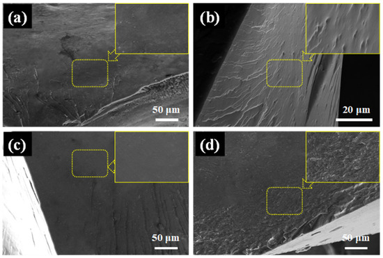 The compatibility of the EP with the added flame retardants directly affects the mechanical properties and flame retardance of the EP nanocomposite coatings. The fracture surface of the composite coatings was analyzed using SEM to demonstrate the compatibility of the flame retardant with the epoxy matrix. As shown in Figure S2, the fracture surface of pure EP was smooth, reflecting its brittleness and weak resistance to crack propagation []. As shown in Figure 11, the fracture surface of PME exhibits a wrinkled and microcracked structure. With the addition of FePM, ZnPM, and BPM, the fracture surfaces became rougher, indicating increased energy dissipation and toughness. This phenomenon can be attributed to the increased presence of intermolecular forces such as hydrogen bonds, which enhance the toughness of the material []. Generally, the binding energy of a system with hydrogen bonds increases significantly, leading to the absorption of more energy during tensile or impact loading, which improves the mechanical properties []. In addition, no agglomeration of nanoparticles was observed on the fracture surface. It has been reported that the active –NH2 groups in the flame retardant can react with epoxy groups at high temperatures, thereby improving the compatibility between the EP matrix and the flame retardant [].