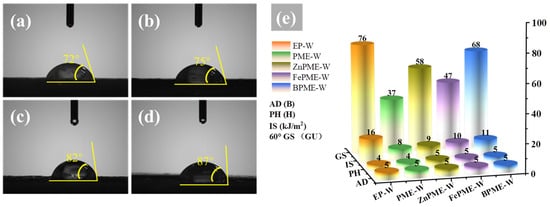 Photographs illustrating the contact angle obtained for (a) PME-W, (b) FePME-W, (c) ZnPME-W, and (d) BPME-W. (e) Mechanical properties of all samples.
