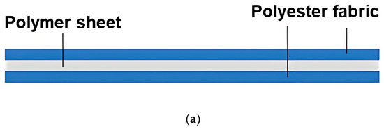 In the process of fabricating layered samples, the polymer (vitrimer, TPU, EVA, STM, or Blu Tack) was firstly hot-compressed into a 1 mm-thick sheet at well above its melting point (if applicable), or compressed at room temperature (about 25 °C) into a 1 mm-thick sheet, if it is easy to deform at room temperature. Hot compression or room temperature compression was repeated one more time with two pieces of polyester fabrics on the top and bottom of the polymer sheet to create strong bonding between layers. After air-cooling to the room temperature, a rectangular sample of 3 cm × 12 cm was cut out (along the stretchable/non-stretchable direction) for a DMA test. Refer to Figure 2 for an illustration of the laminated architecture (Figure 2a) and the actual piece of a three-layered laminated sample (Figure 2b).