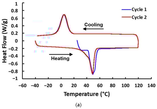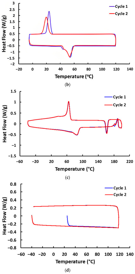 The DSC results of all tested polymeric materials are plotted in Figure 4. In Figure 4a–c, melting and crystallization upon heating and cooling, respectively, in vitrimer, TPU, and EVA, can be clearly observed. However, while TPU and EVA are thermoplastic, so that they are able to flow easily upon heating to above the melting temperature, this type of vitrimer does not flow at all upon heating to its melting temperature. Only at much higher temperatures, where the reversible cross-linking is fully removed, vitrimer becomes easy to flow like normal thermoplastics (refer to [15]). As for STM and Blu Tack (Figure 4d,e), no apparent transition can be observed based on the heat flow-versus-temperature curves.