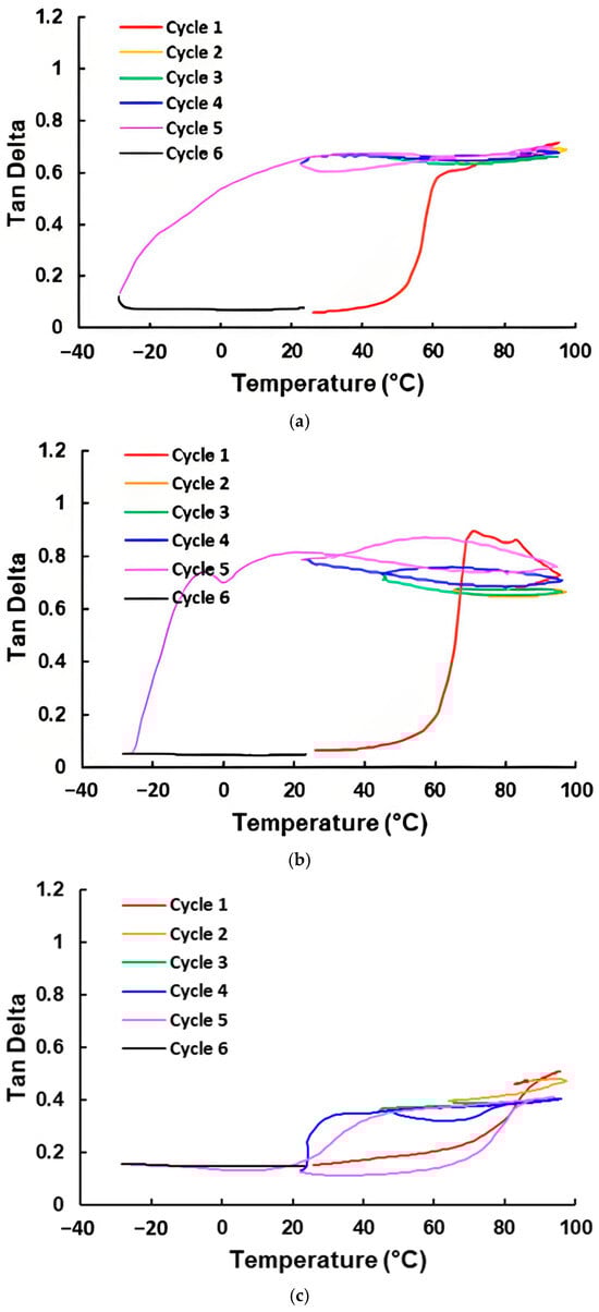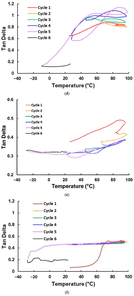 Although the DSC result in Figure 4d does not show any apparent transition, Figure 8b, which reveals the variation in the loss modulus upon thermal cycling, clearly indicates the difference below and above around 20 °C. Of course, it is not within the scope of the current study to explore what the underlying mechanism is. As Figure 7d reveals, the laminated STM sample has the highest TDP after a couple of thermal cycles, reaching around 1 between about 40 °C to 95 °C. Even at the experiment starting point of 20 °C, its Tan Delta is already above 0.6. As for the other material with no apparent transition in its DSC result, Blu Tack, its laminated sample has a relatively stable, but lower Tan Delta value, between 0.3 to 0.4 within the whole tested temperature range (Figure 7e).