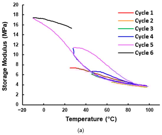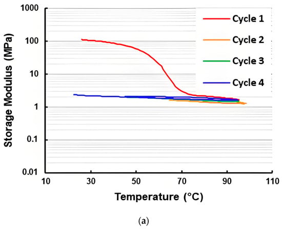 Based on the same experimental data for Figure 7a, the corresponding storage modulus and loss modulus of the three-layered vitrimer sample in the first heating process are plotted in Figure 13. In Figure 14, the storage modulus and loss modulus of the five-layered vitrimer sample (refer to Figure 7f for the corresponding Tan Delta) in the first four cycles are presented. Although the curves of the storage modulus and loss modulus for both three-layered and five-layered vitrimer samples look similar, upon heating to over 70 °C, both the storage modulus and loss modulus of the three-layered vitrimer sample are lower than that of the five-layered vitrimer sample. A closer look reveals that above 70 °C, the storage modulus curve and loss modulus curve of the three-layered vitrimer sample become more and more close to each other upon heating, while the storage modulus curve and loss modulus curve of the five-layered vitrimer sample are always not close. Thus, the TDP of the three-layered vitrimer sample has a higher Tan Delta value (but lower than that of the pure vitrimer sample, i.e., without elastic fabric, as shown in Figure 6a), despite the volumetric fraction of vitrimer being lower in the three-layered vitrimer sample.