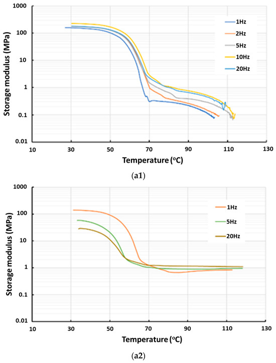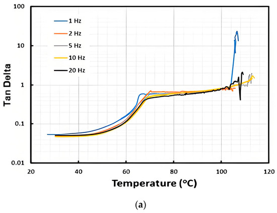 Dicumyl peroxide (DCP) is a commonly used initiator for cross-linking of polymers. TPU 262A, which is vitrimer-like and very much similar to TPUA-123-H1111A used in this study [15], was cross-linked with 2 vol% of DCP. The results of DMA testing, conducted at various frequencies, for samples with and without cross-linking, are illustrated in Figure 11. In Figure 11a, which is for the samples without cross-linking, an apparent TDP at all tested frequencies could be seen. On the other hand, In Figure 11b, which is with cross-linking, an apparent peak appears at around 65 °C in all tested frequencies. The actual shape of the peak and magnitude of Tan Delta depend on the frequency. In the case of 1 Hz, which results in the highest Tan Delta in all three tests, the maximum Tan Delta is less than 0.275.