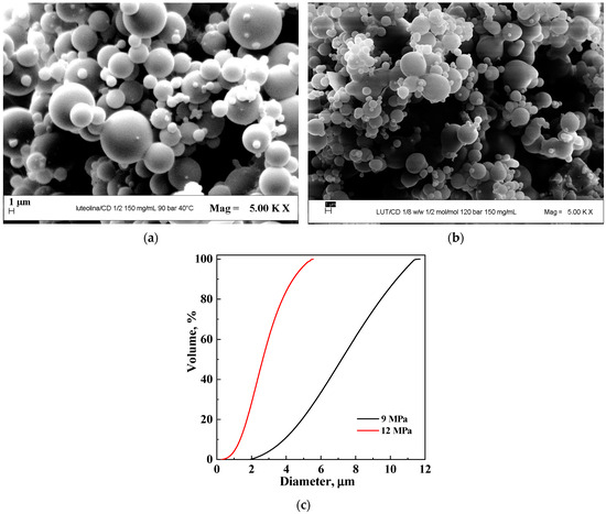 In the next set of experiments, the effect of the LUT/β-CD molar ratio was studied, setting the concentration at 150 mg/mL and the operating pressure at 12 MPa. In particular, the results obtained by fixing the molar ratio at 1/2 and 1/1 were analyzed. Regular microparticles were obtained in correspondence with both the molar ratios, as it is possible to observe in the FESEM images reported in Figure 3a,b. The comparison of the corresponding PSDs in terms of the volumes of the particles is shown in Figure 3c.