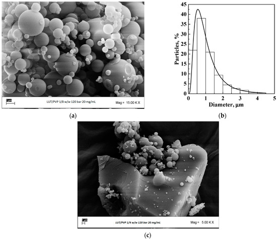 Once the best operating conditions that allowed obtaining micrometric particles using β-CD as the carrier were identified, some tests using PVP were performed. The concentration of the solutes in the liquid solution was fixed at 20 mg/mL because the solubility of LUT + PVP in DMSO was lower than that of LUT+ β-CD in the same solvent. The pressure was imposed at 12 MPa, whereas the ratio between LUT and PVP was fixed at 1/2 mol/mol and 1/1 mol/mol. In the first case, well-defined microparticles with a mean diameter equal to 2.2 μm were precipitated, as it is possible to observe in the FESEM image reported in Figure 4a and from the particle size distribution reported in Figure 4b. Increasing the LUT/PVP molar ratio to 1/1 mol/mol, crystals with few microparticles on them were obtained, as reported in Figure 4c; therefore, the coprecipitation failed when the amount of luteolin with respect to PVP was increased.