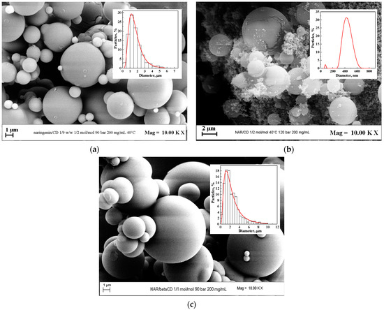 When investigating the naringenin/β-cyclodextrin system, the consequence of the pressure and the API/carrier ratio variation on the morphology, size, and particle size distribution of the powders was assessed.
