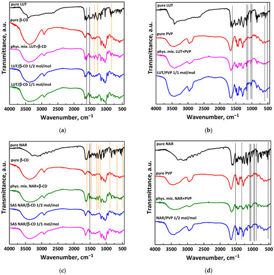 FT-IR spectra of the pure compounds, physical mixtures, and coprecipitated powders: (a) LUT/β-CD; (b) LUT/PVP; (c) NAR/β-CD; (d) NAR/PVP.