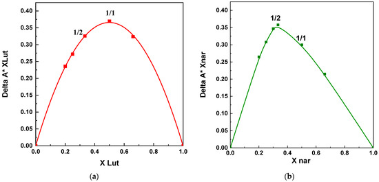 To assess between the two tested ratios, i.e., which of them corresponded to the optimal stoichiometric guest-to-host molecule ratio for the formation of stable inclusion complexes between the APIs and β-CD, Job’s plots were evaluated (see Figure 9). It is possible to observe that the maximum values occurred at different values for luteolin and naringenin, with X equal to 0.5 (corresponding to an equimolar ratio in the case of luteolin) and X equal to 0.33 (corresponding to a 1/2 molar ratio) for naringenin.