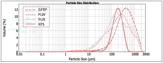 Granulometric distribution of GFRP, PLW, PUR and XPS.