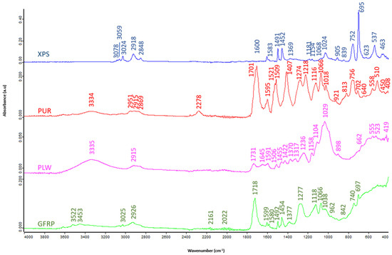 PLW and GFRP show bands appearing at 3335 and 3334 cm−1, respectively, associated with O-H stretching vibration [43]. Between 3078 and 2951 cm−1, N-H stretching vibration bands appear in GFRP, PUR and XPS typical of amides and characteristic of urethanes [43,44,45]. The bands centered around 2900 cm−1 of PLW, PUR and XPS (2915, 2869 and 2918–2848 cm−1, respectively) are associated with C-H stretching vibration associated with methyl and methylene groups [44,45]. The bands around 1700 cm−1 in PLW and PUR (1731 and 1701 cm−1, respectively) correspond to the asymmetric C=O stretching vibration associated with urethanes [45,46]. PLW, GFRP, PUR and XPS show between 1645 and 1218 cm−1 vibrational bands of C=C stretching typical of aromatic rings [47,48]. PLW and GFRP show bands associated with asymmetric C-O stretching vibration between 1158–662 cm−1 and 1066–697 cm−1, respectively [49]. Table 2 shows the characteristic bands for each wavenumber.