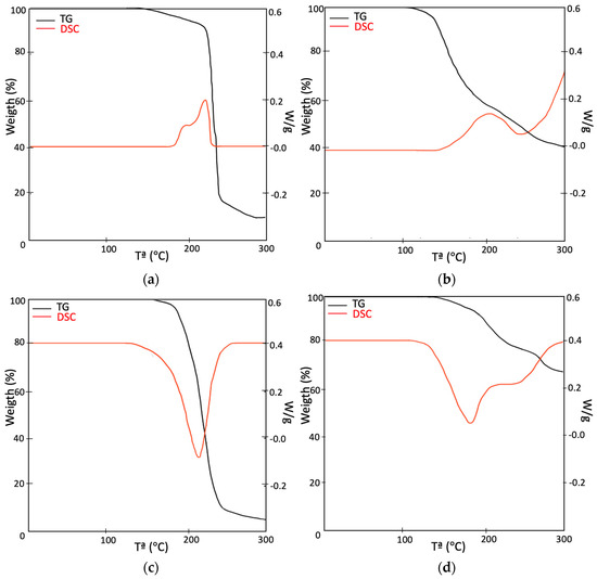 The TG-DSC analysis was carried out to evaluate the thermal stability of the SP-RCM1 and SP-RCM6 sandwich panels, which showed the best results for mechanical resistance, and the performance of each of the resins. The performance was evaluated in an air atmosphere with a flow rate of 50 mL/min at a heating rate of 10 °C/min in the temperature range of 30 to 300 °C.