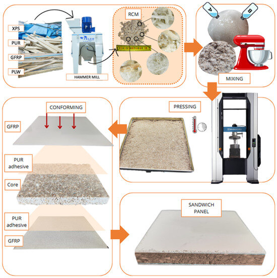 The binder was prepared by mixing the corresponding amounts of resin and hardening agent until a homogeneous mixture was obtained. The cores were obtained by mixing the binder with RCM in the proportions defined in Table 3 in a Proeti planetary mixer. The resulting mixture was poured into a mold measuring 20 × 20 × 2 cm and pressed at 15 MPa in a Shimadzu AG-300 KNX press, with the load being maintained for 6 h at a controlled temperature of 25 ± 2 °C. After the total curing time (24 h), the cores were polished until a flat surface was obtained to facilitate the adhesion of the glass fiber reinforced polyester (GFRP) sheets on the outer faces to obtain the sandwich panels. The adhesion of both GFRP panels was carried out using a PUR Neopur 1791 adhesive in a 75:25 adhesive/hardener ratio. The first 1.4 cm plate was applied uniformly with 165 g/m2 of adhesive and the core was placed on top of the first plate. The second plate, of the same thickness as the first, is adhered by pouring the adhesive over the core and then placing the GFRP plate on top. Then, for a good adhesion of the GFRP plates, a pressure of 1.5 MPa was applied to the sandwich panel and maintained for 6 h. After this time, the panels remained at a controlled temperature of 25 ± 2 °C for 48 h. The curing process was the same for both resins. Figure 4 schematically represents the process developed for the forming of the panels.