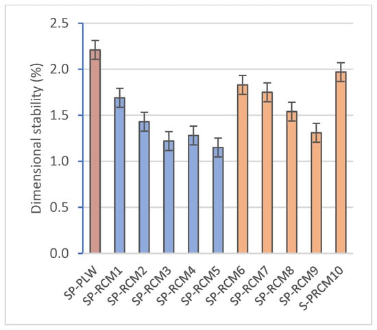 Dimensional stability (%) of SP-PLW and SP-RCM panels.