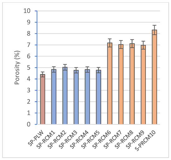 Porosity (%) of SP-PLW and SP-RCM panels.
