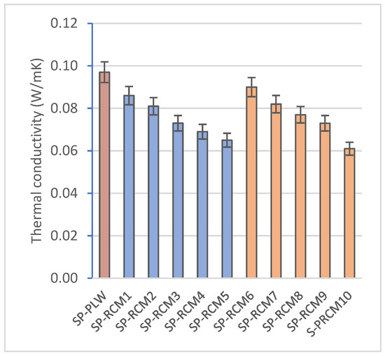 The thermal conductivity values of sandwich panels (Figure 10) are associated with the thermal properties of the constituent materials, with the interaction of these materials in the core and with the thickness. PUR, XPS and PLW have values of 0.024, 0.032 and 0.1 W/mK, respectively, while the thermal conductivity of GFRP is considered negligible. On the other hand, PUR resin has a lower thermal conductivity than polyester resin (0.027 and 0.21 W/mK). The results obtained after the evaluation of the panels confirm this. The panels that were formed with PUR resin showed a higher thermal resistivity, obtaining values between 0.065 (SP-RCM5) and 0.086 W/mK (SP-RCM1). In contrast, the polyester resin composite panels showed significantly higher thermal conductivity values (between 0.134 (SP-RCM6) and 0.097 W/mK (SP-RCM9)). The decrease in the thermal resistivity of SP-RCM10 is associated with the increased porosity of the panel due to the aforementioned problems. On the other hand, the conductivity value of SP-PLW (0.097 W/mK) is higher than those of SP-RCM panels as a consequence of the constituent material and the lower porosity of the material.