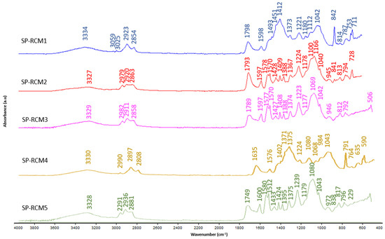FTIR patterns: SP-RCM1–SP-RCM5.