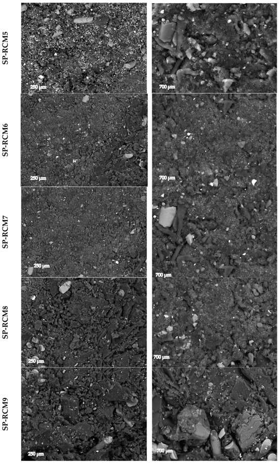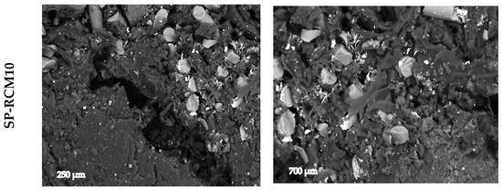 All SP-RCM panels formed with GFRP (X), PUR (Y), XPS (Z) and PLW (W) and PUR and polyester resins were analyzed by SEM after 72 h of curing at room temperature (Figure 16). The bonding of the interfaces of the core materials was optically analyzed to evaluate the adhesion. The correct adhesion of the materials is related to improvements in thermal stability due to better thermal distributions. SP-RCM10 shows a less densified structure as a consequence of the chemical incompatibility of the polyester resin and the XPS. The reaction produced between the polystyrene contained in the XPS and the styrene present in the polyester resin produces solvent attacks that result in a weakening of the XPS structure and a lack of cohesion and loss of mechanical properties. SP-RCM1 and SP-RCM6 show the densest and most uniform structures (700 µm) related to a better integration of the core materials. In all panels, elongated fibers are observed corresponding to GFRP present in the cores. SP-RCM10 shows a higher degree of GFRP agglomeration due to workability problems of the RCM mix and polyester resin and the degradation of other components such as XPS.