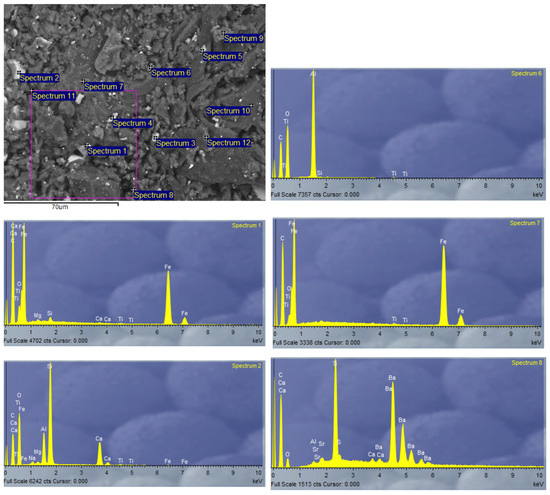 Due to the heterogeneity of the constituent materials of the panels, EDX analysis was performed on SP-RCM1 and SP-RCM6 to analyze the morphology. Figure 17 and Figure 18 show high concentrations of carbon (C) and oxygen (O) characteristic of the polymers (PUR and polyester resin) and organic matter present in PLW. The presence of calcium (Ca) and silicon (Si) is related to the inorganic components of the reinforcements in the GFRP layers because this material is mainly composed of SiO2 and CaO. On the other hand, the presence of barium is related to the additives present in PLW coatings.