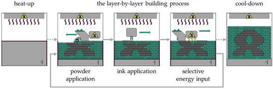 In the HSS process, a polymer powder is selectively melted by a sintering lamp using a Radiation Absorbing Material (RAM), which is selectively applied to the surface of the powder bed. The HSS process is shown schematically in Figure 1. As with other PBF/P processes, the heat-up is essential for processing the polymer powder. This is because the polymer powder must be brought to a temperature just below its melting point to avoid thermal disturbances in the process. In the first step of the layer-by-layer building process, the recoater applies a thin layer of polymer powder to the surface of the powder bed (powder application). A print head then selectively applies ink to the areas to be fused (ink application). The ink contains carbon black, which acts as a RAM. The sintering lamp is then moved across the powder bed surface (selective energy input). The temperature of the inked powder is raised above its melting point due to the RAM’s high absorption capacity. Due to the lower absorption of the radiation from the sintering lamp, the polymer powder not wetted by the ink does not fuse and remains loose, acting as a support. These steps—powder application, ink respective RAM application and selective energy input—are repeated until all parts have been produced. Loose powder and parts must be cooled (cool-down) before parts can be removed from the powder bed [4,5,6].