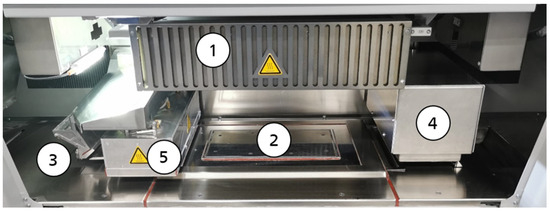 Build chamber of the VX200 HSS (➀ overhead heater, ➁ build chamber, ➂ recoater, ➃ printhead unit, ➄ sintering lamp).