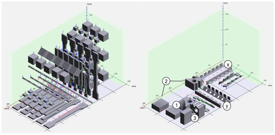 To analyze the minimum feasible geometric elements, two different specimens (minimum wall thickness specimens and minimum gap dimension specimens) were designed according to the draft of VDI 3405 Part 3.2 [39]. Both were manufactured by different orientations in the build job (Figure 3), regarding the alignment of the specimens in the x- and y-directions and in 0°, 45° and 90° rotations towards the xy-plane. The square wall of the minimum wall thickness specimens had a side length of 10 mm. The different wall thicknesses range from 200 µm to 700 µm in increments of 100 µm. At a 0° rotation, the square wall is oriented parallel to the xy-plane. The minimum gap samples have a wall gap length of 15 mm and a gap height of 25 mm. The gap thicknesses used are 200 µm to 1000 µm in increments of 100 µm.
