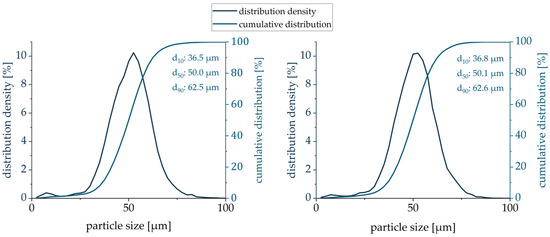 Volume-based PSD for virgin (left) and mixed (right) PA12 powder.