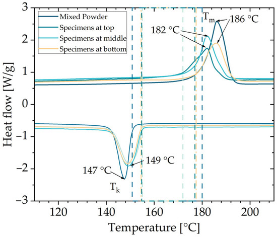 In the HSS process, materials are processed under the influence of temperature. Understanding the thermal properties of the material is, therefore, essential. Both powder and specimens were tested to determine their thermal properties and the percentage crystallinity φc using Differential Scanning Calorimetry (DSC). Samples were prepared by cutting pieces from cubes located at the top, middle and bottom of the build job (Figure 3). Measurements were performed in a calorimeter DSC 1 by Mettler Toledo according to DIN EN ISO 11357-1 [30]. Samples of 10 ± 3 mg were heated from 0 to 220 °C and subsequently cooled back to 0 °C at the same heating and cooling rate of 10 K/min.