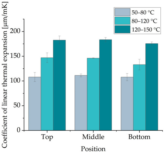 The change in length of the specimens as a function of the temperature showed linear behavior in the following temperature ranges: 50–80 °C, 80–120 °C and 120–150 °C. The CLTE α values for these temperature ranges are shown in Figure 7. While the position of the specimens in the build chamber has no significant effect on the CLTE α, a clear difference between the temperature ranges and the CLTE α was observed. Higher CLTE α values, up to ~75%, were found in the temperature range of 120–150 °C compared to those in the range of 50–80 °C.