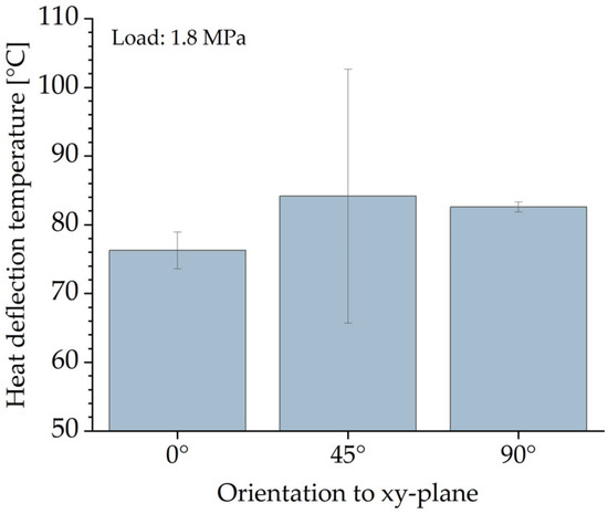 Heat Deflection Temperature (HDT) was tested on bending bars (Table 2), oriented at 0°, 45° and 90° to the xy-plane. Three specimens were tested for each orientation. The tests were performed in accordance with ISO 75-2 [33] using a bending stress of 1.8 MPa on a CEAST HDT VICAT3 by Instron.