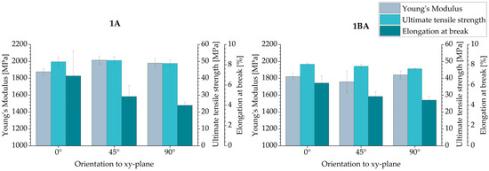 When comparing the results of the two types of tensile bars, it was observed that the smaller tensile pars (1BA) tended to have slightly lower values of Young’s modulus and ultimate tensile strength. The most significant difference in Young’s modulus between 1A and 1BA tensile bars was observed for tensile bars with an inclination of 45°. An approximately 15% higher Young’s modulus was obtained for type 1A than for 1BA. Due to the smaller size, 1BA tensile bars have a smaller-cross section and a larger circumference-to-area ratio than 1A tensile bars. This could lead to an increased effect of possible cross-sectional defects and an increased surface notch effect, which could negatively affect the mechanical properties of the 1BA tensile bars compared to the 1A tensile bars. The impact of the notch effect could be particularly significant for specimens with a 45° inclination. The difference in elongation at break was less obvious. Both types of tensile bars showed almost similar results, which were within the standard deviation.