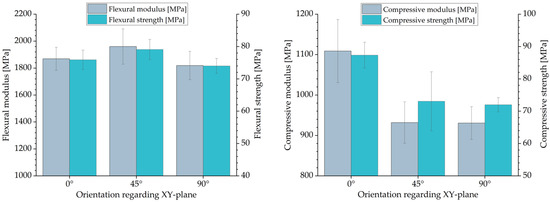 Flexural-(left) and compressive (right) properties regarding their orientation in the build job.