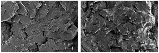 After the tensile tests, the fracture surface of the tensile bars was examined by SEM. SEM images of the tensile bars confirmed the low elongation at break, compared in Table 4, by showing brittle fracture behavior. The stepped brittle fracture bands [58] were particularly well observed in the 90° specimens (Figure 11, left) and appear to propagate within a plane fracture surface. For the 45° specimens (Figure 11, right), the fracture surface showed a more uneven but also brittle behavior, spreading more radially and showing similarities to a shear fracture. In the SEM micrograph of the 0° specimen (Figure 12, left), in addition to the brittle fracture paths, areas with deviating fracture surfaces could be detected. The magnified image (Figure 12, right) shows structures approximately 50 nm in diameter, which are thought to be carbon black of the ink. At the interface, the PA 12 fracture surface appears to be smeared rather than sharp-edged, suggesting an increase in the ductility of the specimen.