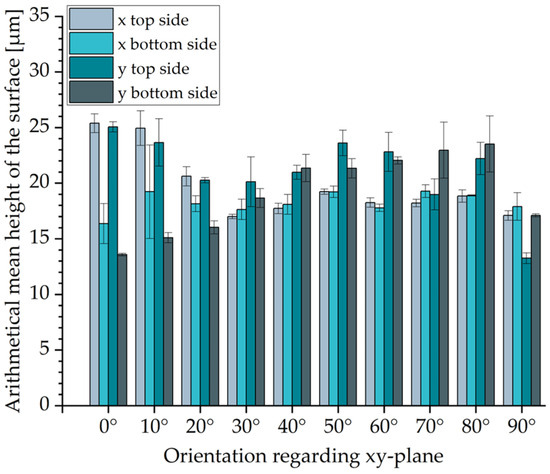 For the inclination of 30° to 80° regarding the xy plane, a difference between the orientations of the specimens in the x- and y-directions can be seen. Parts oriented in the x-direction achieve lower values than those oriented in the y-orientation. This is probably due to the influence of the direction of the movement of the recoater. Furthermore, there is no significant difference between the top and bottom sides of the segments with an inclination of 30° to 80°. For inclinations from 0° to 20°, the top side of the segment has a significantly higher value. At a 90° inclination and orientation in the x-direction, there is no significant difference between the top and bottom sides. This is because both are perpendicular to the xy-plane and parallel to the movement of the recoater. Because this is not the case in the y-direction, there is a significant difference between the top and bottom sides. The highest value (~25 µm) was measured on the top side of the segments positioned horizontally (0°) to the xy plane. The lowest value (~14 µm) was measured on the bottom side of the segment positioned horizontally (0°) and on the top side of the segment positioned vertically (90°) in the xy-plane.