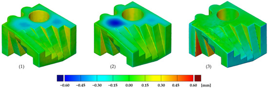 Geometric deviation of the geometric accuracy specimens oriented in the x direction (1) (left), y direction (2) (middle) and z direction (3) (right), displayed as a false-color image.