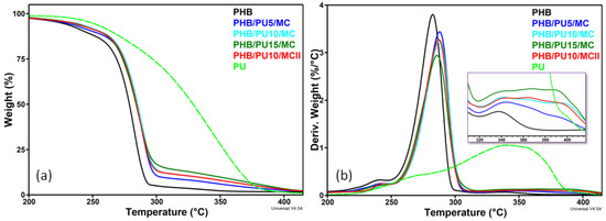 The addition of PU and MC in the PHB matrix improved its thermal stability, shifting the onset of degradation towards higher temperatures (Figure 2a,b). Thus, the temperature at 10% weight loss (T10%) increased by 7 °C for the PHB/PU5/MC composite compared to the unmodified PHB, and by 11.2–12.5 °C for the composites with a higher content of PU, while the Tmax of the composites was higher by 3–5 °C than that of PHB (Table 2).