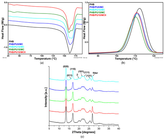 The melting (Tm) and crystallization (Tc) temperatures of PHB were slightly influenced by the addition of PU and MC (Figure 3a,b; Table 2). Thus, Tm and Tc of the composites were lower by a maximum of 1.6 °C and 2.2 °C, respectively, than those obtained for neat PHB (Table 2). A similar behavior was reported for PHBV/PU blends [10]. A difference between the thermal behavior of the composites and that of PHB is the occurrence of a shoulder in the melting curves of the composites at temperatures higher than Tm (Figure 3a). This shoulder indicates the bifurcation of the melting peak and appeared more clearly as the PU content in the composites increased. This shows that PU enhanced PHB recrystallization during melting and favored the formation of larger crystals.