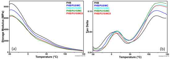 The variation of the storage modulus (E’), which is a measure of the energy stored in the sample, with temperature is shown in Figure 4a and the variation of damping (tan δ) is presented in Figure 4b. All the samples underwent a sudden decrease in E′ value from −40 °C to about 50 °C, which corresponds to the glass transition, and a second slower decline in E’ value at above 50 °C, which corresponds to the crystal–crystal slip transition [29,43]. While small deviations around 120 °C were noticed for the temperature of the second transition, the glass transition temperature (Tg) determined from the tan δ variation with temperature showed a clear increase for the composites compared to neat PHB and also showed an increase with the PU content in the composites, with a similar trend being obtained by DSC analysis. This increase in the Tg value is determined by the interactions between the components of the composites, PHB, PU, and MC, which leads to a lower mobility of the PHB chains [10,43]. Although both DSC and DMA showed an increase in the Tg value of PHB after PU and MC addition, the temperature jump for the entire series is larger in the DMA measurements, of 8.9 °C vs. 4.5 °C in DSC (Table 4). This is due to the oscillating deformation applied to the sample, which, together with temperature, determines a more significant response of the material to the combined action of the two stimuli. The difference of 20–25 °C between the glass transition temperatures determined through the two methods is due to the difference between the measurement techniques, with DSC measuring the heat flow relative to a reference and DMA measuring mechanical stiffness and energy absorption as a result of the applied oscillation [44,45]. As seen in Table 4, the E′ values at different temperatures decreased with the increase in the PU concentration in the composites. However, the decrease in stiffness did not exceed 20% at room temperature for the composites obtained by using a masterbatch. A greater decrease in the E′ value was observed when the PU content increased from 5 to 10 wt% than when it increased from 10 to 15 wt%, which is possibly due to morphological differences between these composites.
