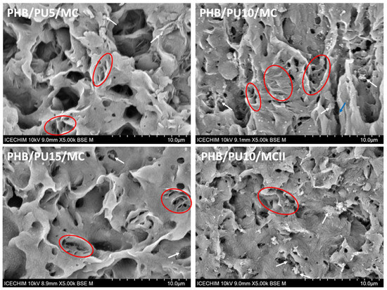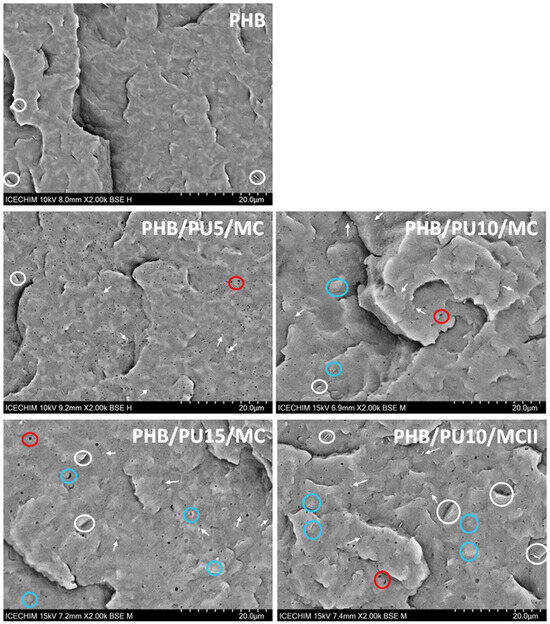 The presence of PU elastomers is hardly visible in the SEM images of the composites. PU is not miscible with PHB, with which it forms multiphase systems, consisting of small PU droplets dispersed in the PHB matrix [10]. However, such droplets were not observed in the SEM image of PHB/PU5/MC, and they were hardly visible in the composites with 10 and 15 wt% PU, being marked with blue circles in Figure 5. It can be assumed that the presence of MC ensured better dispersion of the elastomeric phase in the composites, which made the droplets no longer visible, as previously observed for other PHBV/PU systems [12]. However, larger and poorly distributed formations, which can be attributed to the PU modifier, were observed in the SEM image of PHB/PU10/MCII. The direct mixing of the components instead of using a masterbatch could be the cause of this observation.