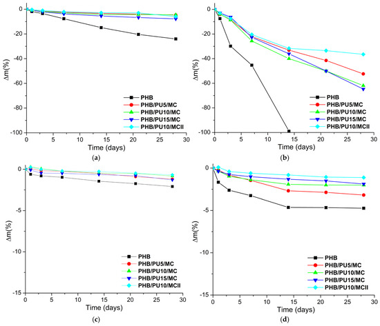 A lower mass loss was observed after 28 days of alkaline hydrolytic degradation for PHB/10PU/MCII compared to PHB/10PU/MC (Figure 6b). This behavior may be explained by the poorer dispersion and larger size of the PU inclusions in PHB/10PU/MCII, as determined by the direct mixing route adopted in this case and also by the higher PHB crystallinity of PHB/10PU/MCII compared to PHB/10PU/MC, which reduced the hydrolytic degradation ability of PHB [52,66].