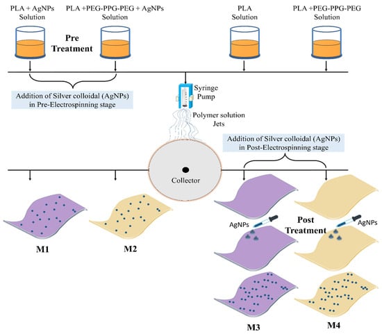 The prepared pure PLA, PLA/PEG-PPG-PEG, PLA/AgNPs, and PLA/PEG-PPG-PEG/AgNPs dope solutions were added one at a time to a 10 mL syringe nozzle fitted with a 23-gauge needle for electrospinning. The machine (MECC, Fukuoka, Japan; model NF-500) was operated at a voltage of 21 kV until the 10 mL syringe was empty. During the electrospinning process, the needle was positioned at 15 cm from the flat collector, with a solution flow rate of 0.8 mL/h, while the ambient humidity was kept at 10%. Following the electrospinning, the nanofibrous fabric was detached from the collector and then dried overnight at 45 °C in an electrical oven. The samples were then preserved for characterization using various labels, as shown in Table 1.