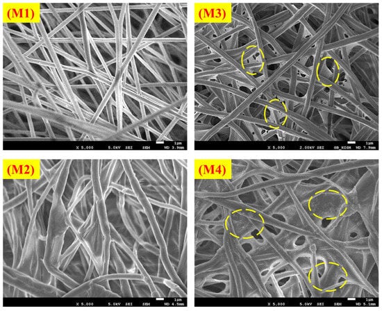 FE-SEM morphological images of the prepared PLA-based nanofibrous electrospun fabrics: (M1–M4).
