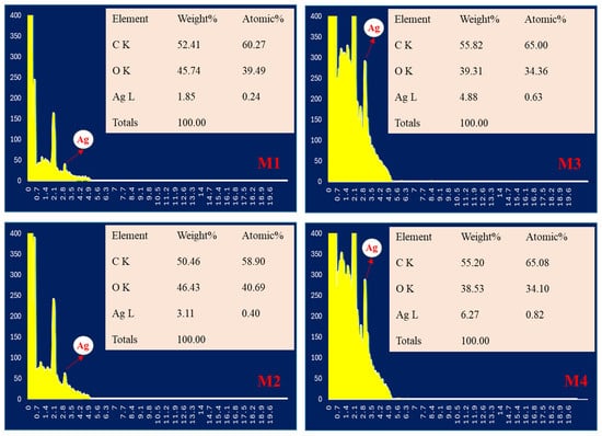 The elemental compositions of the PLA-based nanofibrous textiles after the incorporation of AgNPs were analyzed using EDX spectrum curves. Figure 4 depicts the EDX elemental spectra and elemental contents of fabric samples M1–M4. The EDX spectra and elemental analysis in Figure 4 confirm the presence of colloidal silver in all samples. When AgNPs were integrated into M1 in the pre-electrospinning stage, the elemental contents were 54.41% carbon (C), 45.74% oxygen (O), and 1.85% Ag. With the integration of the Ag hydrophilic membrane via pre-electrospinning (M2), the Ag content increased, whereas the carbon content decreased. In contrast, in samples M3 and M4, the presence of Ag increased with the incorporation of Ag after electrospinning via solution casting. The highest Ag content and spectrum peak were observed for sample M4, with a slight decrease in the carbon content. This indicates a good interaction between the Ag and the membrane surface. The peak of the platinum coating was not counted and removed, and atomic elemental analysis was performed. Silver colloids were successfully integrated into the membranes; however, the incorporation of AgNPs through solution casting resulted in a higher quantity of Ag compared to the pre-electrospinning stage. The higher Ag content observed in samples M3 and M4 can be attributed to the presence of PEG-PPG-PEG, which enhanced the retention and absorption of the Ag solution within the nanofibrous structure. PEG-PPG-PEG functions by reducing the attractive forces among NPs, increasing the steric distance between them and improving the hydrophilicity. Consequently, this led to an improved dispersion of the AgNPs and a higher concentration of Ag detected in the elemental analysis [].