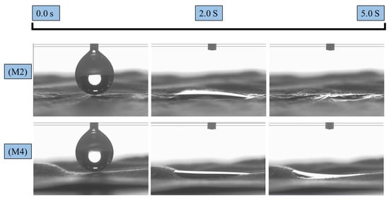 Figure 5 and Figure 6 illustrate the effects of incorporating AgNPs into the electrospun textiles. Contact angle measurements were conducted for all hydrophobic and hydrophilic textiles. The wettability behaviors of the pure PLA fabric with AgNPs added during the pre-and post-electrospinning stages (M1 and M3) are shown in Figure 5. M1 exhibited a stable water droplet with a CA of 128° after 3 min, demonstrating PLA’s hydrophobic nature. By contrast, M3 exhibited a reduced CA of 92° for the same duration. This decrease in hydrophobicity may be attributed to the direct interaction between the silver colloidal solution and the PLA membrane surface. During the solution casting of colloidal silver, the solution contained low-surface-energy liquids, such as isopropanol, which infiltrated the pure PLA surface and diminished its wettability. Figure 6, however, demonstrates the hydrophilic characteristics of samples M2 and M4, where the surface CA of the water droplet rapidly reached approximately 0°, as the membrane surface completely absorbed the water within 2 s. This phenomenon occurred because the addition of PEG and AgNPs to PLA created a hydrophilic environment that rapidly attracted water molecules []. This enhanced hydrophilicity contributes to protecting textiles against bacterial activity, as water can penetrate the fiber matrix and interact with antibacterial agents, such as silver.