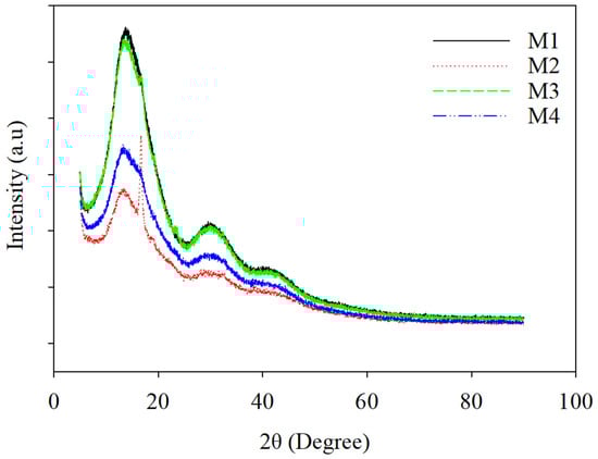 Figure 7 depicts the X-ray diffraction (XRD) patterns of the PLA-based electrospun nanofiber textiles, which were categorized based on their hydrophilicity and the method of AgNP incorporation (M1, M2, M3, and M4). The XRD curves for these multi-functional electrospun textiles exhibit prominent diffraction peaks between 2θ = 13 and 19°, confirming the amorphous structure of PLA and PEG-PPG-PEG in the membranes, corresponding to the (203) crystal plane []. The integration of PEG-PPG-PEG and AgNPs resulted in decreased diffraction peak intensity, indicating reduced crystallization in the PLA/PEG-PPG-PEG/AgNP samples (M3 and M4). Moreover, the peak broadening observed in M3 and M4 suggests an increase in the amorphous regions due to the PEG-PPG-PEG content in the nanofiber fabrics. Compared to the pristine sample, the XRD peaks for the PLA blends were nearly identical to those of the pure hydrophobic PLA and hydrophilic PLA/PEG-PPG-PEG membranes, as shown in Figure S2. However, the diffractive intensities of the blends increased due to the presence of AgNPs. Minor diffraction peaks were detected in all samples, which could be attributed to the microcrystallinity of the PLA, PEG-PPG-PEG, and AgNPs. Notably, a distinct and broad peak at around 38–44° was observed in the composites containing AgNPs, which can be ascribed to the 111 and 200 crystallographic planes of the face-centered cubic (FCC) silver crystals, respectively []. The increased crystallinity in samples M3 and M4 was evident from the decreased amorphous region area around 2θ = 13 and 19°. This enhancement resulted in significant reductions in the amorphous region area, with M3 showing a 62% decrease and M4 demonstrating a 49% decrease when compared to samples M1 and M2, respectively.