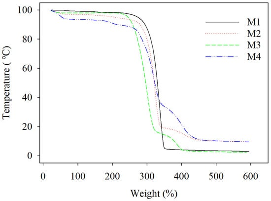 TGA results of the prepared nanofibrous electrospun cloth: (M1) PLA-Ag-E, (M2) PLA-Ag-S, (M3) PLA-PEG-Ag-E, and (M4) PLA-PEG-Ag-S.