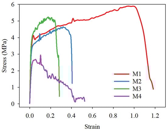 The mechanical properties of the PLA-based electrospun textiles were evaluated through tensile strength analysis, as illustrated in Figure 9. The stress–strain curves revealed three distinct phases in the mechanical behavior of the nanofiber garments. Initially, a linear elastic region with a steep slope was observed, followed by a gradual increase in stress levels. The final phase was characterized by rapid failure, resulting in a significant reduction in stress. Samples M1 and M3 exhibited comparable ultimate tensile strengths of 5.9 and 5.6 MPa, respectively, due to their similar material compositions. However, their elongation percentages differed significantly, with M1 reaching 120% and M3 only 40%. This disparity can be attributed to the post-electrospinning incorporation of AgNPs in M3 through solution casting, which introduced brittleness to the material. Samples M2 and M4, containing hydrophilic PEG-PPG-PEG components, demonstrated lower tensile strengths of 4.8 and 2.3 MPa, respectively. Their elongation percentages were 30% for M2 and 39% for M4. The post-electrospinning treatment applied to M4 resulted in reduced tensile strength compared to M2. The observed decrease in the mechanical properties of the post-treated samples (M3 and M4) correlates with their diminished thermal characteristics. This correlation may be explained by the lower crystallinity of these samples, as evidenced by the XRD analysis. The post-electrospinning treatment likely disrupted the molecular alignment and crystalline structure of the fibers, leading to reduced mechanical and thermal performance. These findings emphasize the need to balance the incorporation of AgNP functional additives with preserving mechanical properties in electrospun textiles. Future research should aim to optimize post-electrospinning treatments to reduce adverse effects on the mechanical and thermal properties while maintaining functionality.