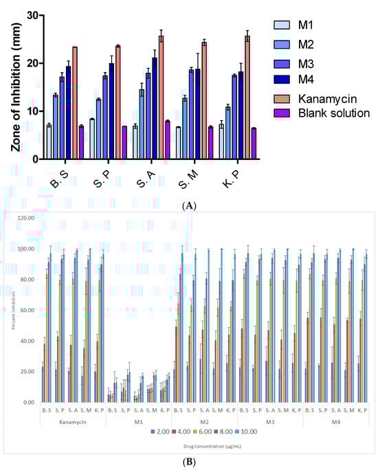 The antibacterial activity of all samples was also evaluated using the OD600 method. The antibacterial activity of kanamycin (standard) and test samples (M1, M2, M3, and M4) was evaluated against five bacterial strains (B.S, S.P, S.A, S.M, and K.P) using the OD600 absorbance method. Serial dilutions of the samples (2 to 10 µg/mL) were prepared in a 96-well microtiter plate, with each concentration tested in triplicate. Bacterial cultures were adjusted to 0.5 McFarland standard and inoculated into the wells. After 18 h of incubation at 37 °C, OD600 values were measured to assess bacterial growth and % inhibition was calculated using its standard formula reported in the literature [].
